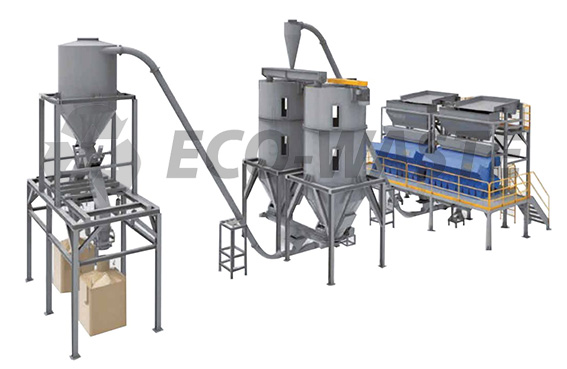Секция смешивания и упаковки. Включает в себя автоматическую сортировку флексы вихревым потоком, движение материала по трубам к месту упаковки. Устройство для взвешивания на линии может контролировать производственный процесс в режиме реального времени. Упаковочный блок, используя преимущества специально разработанной системы встряхивания, обеспечивает упаковку флексы до фиксированного веса и максимизировать насыпную плотность, что значительно снижает расходы на упаковку и транспортировку.