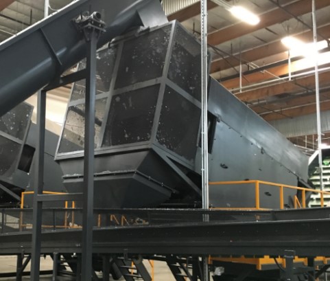 Барабанный грохот (сепаратогр) разбивает комки отходов ПЭТ, отделяет мелкий мусор и части крышек.
